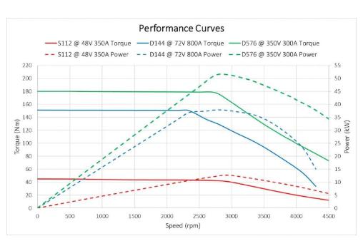 The peak torque produced ranges from 45Nm to 160Nm. The peak power ranges from 10kW to 60kW. Coupled with industry leading efficiencies up to 4000rpm, these motors excel within the automotive, marine and off-way industries.